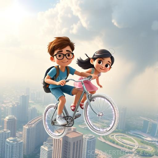 With a gentle push, the bicycle lifted off the ground! Benny and Lily gasped as they soared above the rooftops, passing by gleaming HDB flats and the iconic Marina Bay Sands. The wind tickled their faces, and the city sparkled below like a treasure chest. Suddenly, a dark storm cloud loomed ahead. The bicycle hesitated—should they turn back or brave the storm? Benny took a deep breath, remembering that true bravery is facing fears with friends by your side.
