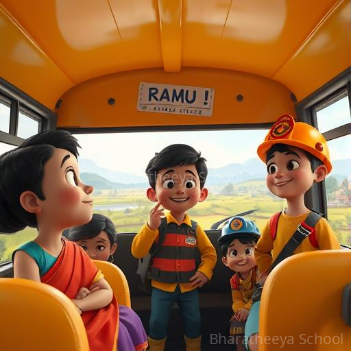With everyone safe and the fire finally out, the children breathe a sigh of relief. They realize how important it is to stay calm and listen carefully during emergencies. The atmosphere is filled with gratitude and newfound confidence. The bus ride continues, but now the children are more cautious and aware, their hearts full of pride for their bravery. Ramu and Sita smile happily, knowing they helped save their friend and learned a valuable lesson about courage and safety.