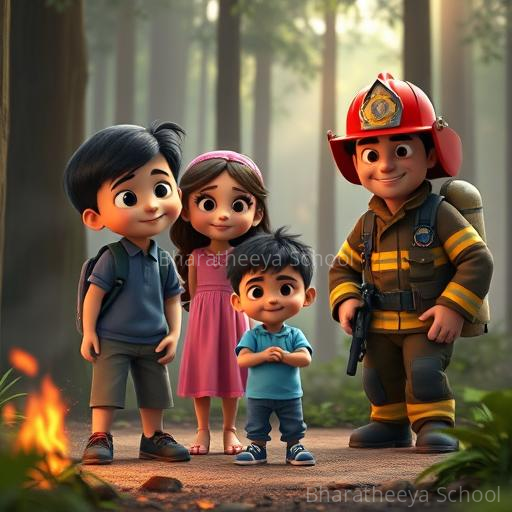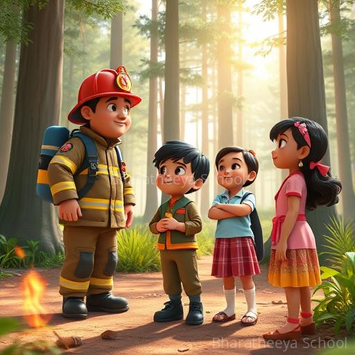 A brave firefighter arrives swiftly, his uniform shining in the sunlight. Calmly, he explains how to stay safe around fire, showing the children how to keep a safe distance and stay quiet. Ramu listens carefully, remembering the safety rules. He gently helps Sita and his friends stay calm, their faces slowly relaxing as they understand what to do. The firefighter skillfully uses his tools to control the fire, making the flames disappear like magic, while the children watch in awe and relief.