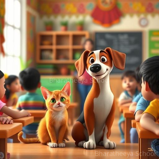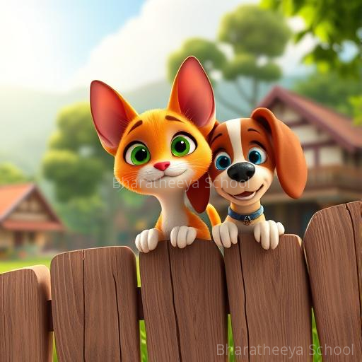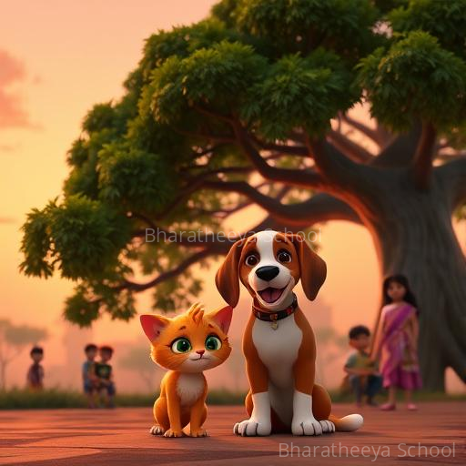 On a bright, sunlit morning in a lively Karnataka village, Makku the ginger cat and Rocco the cheerful beagle dog peeked over the village fence, their eyes sparkling with curiosity. They had heard about the colorful school with its cheerful children and wondered what it would be like to learn and play there. Their hearts fluttered with excitement and a tiny dash of nervousness as they imagined stepping into a world of stories and songs, dreaming of becoming brave explorers of knowledge.