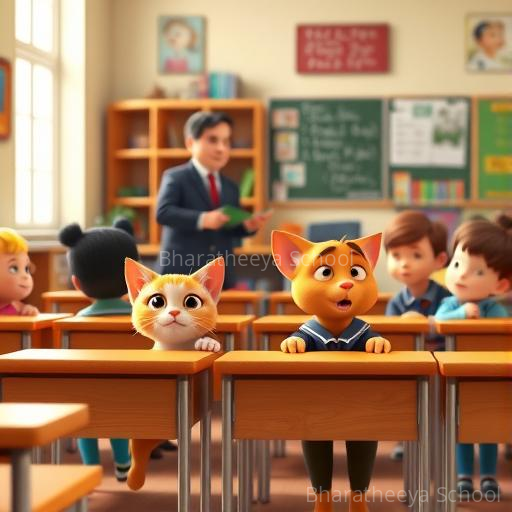 The next morning, Makku and Rocco returned, more clever and confident. They wore better disguises and quietly sat at the back of the classroom, listening carefully. When the teacher asked about the lesson, they paid close attention, their eyes shining with curiosity. Rocco even answered a simple question, making Makku purr with pride. The children smiled at their brave friends, and the teacher nodded kindly, sensing their genuine eagerness to learn. Makku and Rocco felt a warm glow of accomplishment inside.