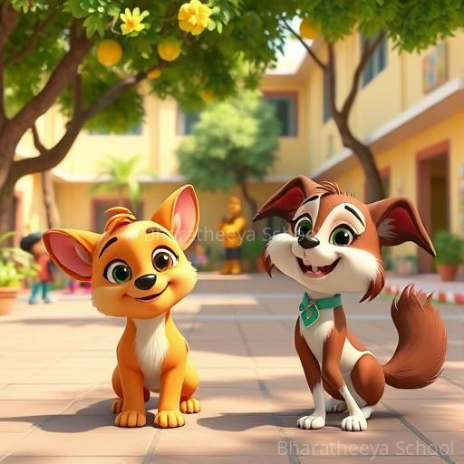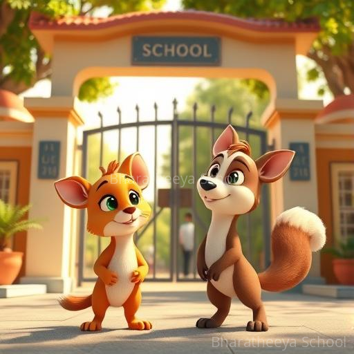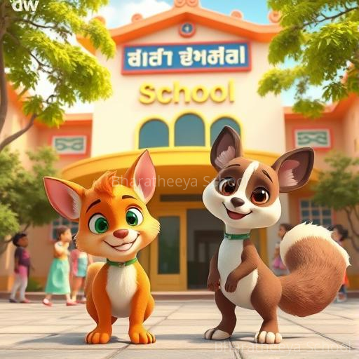 In the bustling city of Bangalore, Makku the ginger cat and Rocco the cheerful beagle dog eagerly approach their new school. The vibrant playground is filled with children laughing and playing, while the colorful school building stands tall with its shining windows. Their hearts flutter with excitement and a tiny pinch of nervousness as they step closer, dreaming of learning new things and making friends amidst the lively chaos.