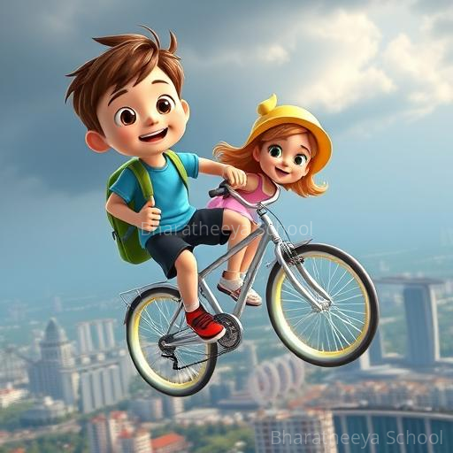 With a gentle push, the bicycle lifted off the ground! Benny and Lily gasped as they soared above the rooftops, passing by gleaming HDB flats and the iconic Marina Bay Sands. The wind tickled their faces, and the city sparkled below like a treasure chest. Suddenly, a dark storm cloud loomed ahead. The bicycle hesitated—should they turn back or brave the storm? Benny took a deep breath, remembering that true bravery is facing fears with friends by your side.