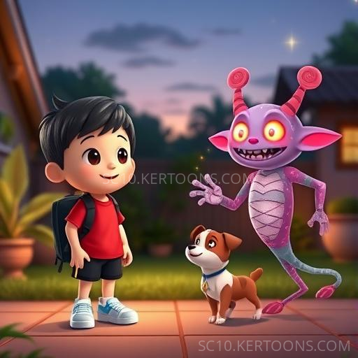 The spirit challenges Ah Boy to a game of wits, with swirling clouds and twinkling lights around them. Ah Boy feels his heart pounding—should he trust his clever ideas or give up? Mimi nudges him gently, reminding him to be kind and honest. With a deep breath, Ah Boy suggests sharing the magic with everyone, showing the spirit that true treasure is kindness and sharing. The spirit pauses, surprised by Ah Boy’s honesty, and begins to glow softly, realizing that goodness is the greatest magic of all. The backyard fills with warmth and gentle light, as the spirit decides to leave peacefully, leaving behind the glowing clay pot.