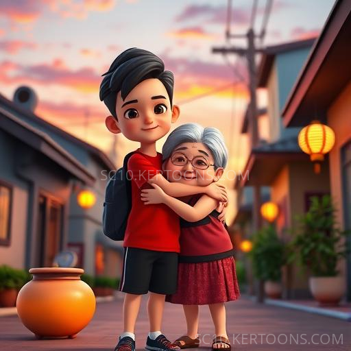 As the spirit peacefully departs, the clay pot glows brighter than ever, revealing its gentle magic. Ah Boy feels a warm glow in his heart, realizing that honesty and kindness are the real treasures. He gently places the glowing pot into his bag, feeling proud and wiser. Walking back through the neighborhood, he knows that sharing and caring make every day special. When he reaches home, he hugs his grandma, thankful for the adventure and the lesson that magic isn’t just in pots, but in our hearts. The sunset paints the sky in shades of orange and pink, reminding him that kindness makes everything brighter.