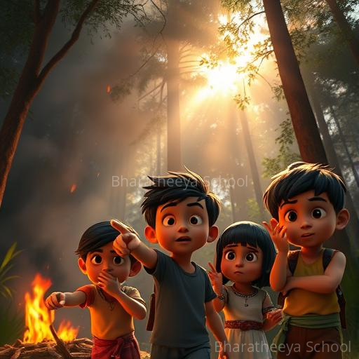 Suddenly, a dark plume of smoke rises from the nearby forest, making the children gasp in surprise and worry. The sky darkens with fear as tiny flames flicker among the trees. Ramu and Sita clutch each other's hands, their eyes wide with concern. The children feel a shiver of fear, unsure of what to do as the fire crackles and sparks dance in the air. The peaceful morning turns into a moment of urgent challenge, testing their courage and calmness.