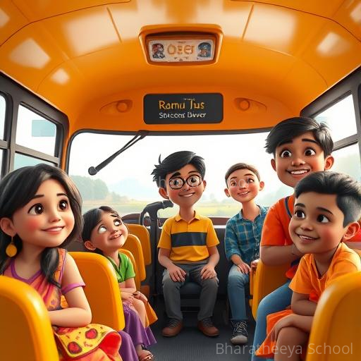 On a radiant morning in a cheerful Karnataka town, Ramu and his friends eagerly board the colorful school bus. The sun casts golden rays over lush fields and distant hills, filling their hearts with excitement. As the bus rumbles along, the children chatter happily, dreaming of the adventures awaiting them in the countryside. Ramu feels a flutter of joy, knowing today will be special, full of new sights and fun memories.